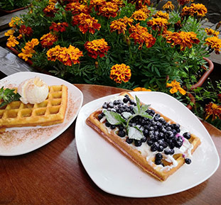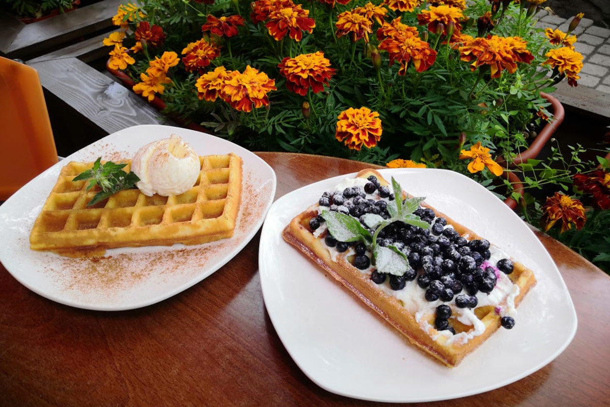 Очень вкусные венские вафли с клубникой, малиной и мороженым, а так же чай, кофе. Всегда забегаю, когда есть время.